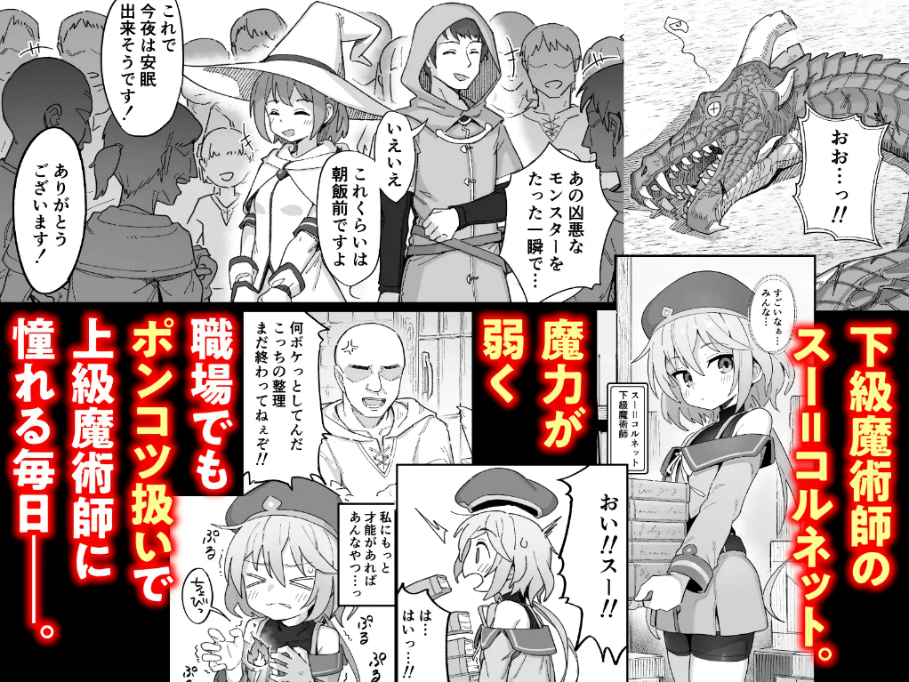 上級魔術師がドラゴンを討伐して街の人たちから褒め讃えられている光景を遠目から見ていた主人公である下級魔術師のスー=コルネット。彼女は魔法の腕があまり良くないいわゆる落ちこぼれで、倉庫整理の仕事でおじさん相手にこき使われる冴えない日々を送っていた。
