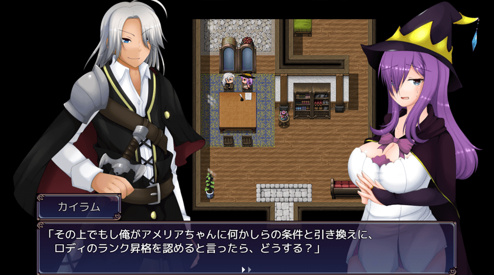 ある日、仕事に励みすぎた事が原因で体調を崩して倒れてしまうロディ。アメリアは彼の事が心配な余り薬を買いに出かけ、ジルドという老人が営む薬屋で特製の薬を調合してもらうことに。しかしジルドはかなりのスケベなおじいさんで彼女の爆乳おっぱいを見て何とか自分のものにできないか画策を始めます。