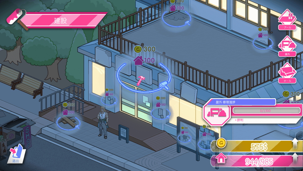夜の時間帯にはポスター配布や施設の壊れている箇所を修理する事でプール施設の人気を上げる事ができます。人気はメインヒロインとのイベント進行に必要だったり、上げる事で新たなサブヒロインが登場するようになります。