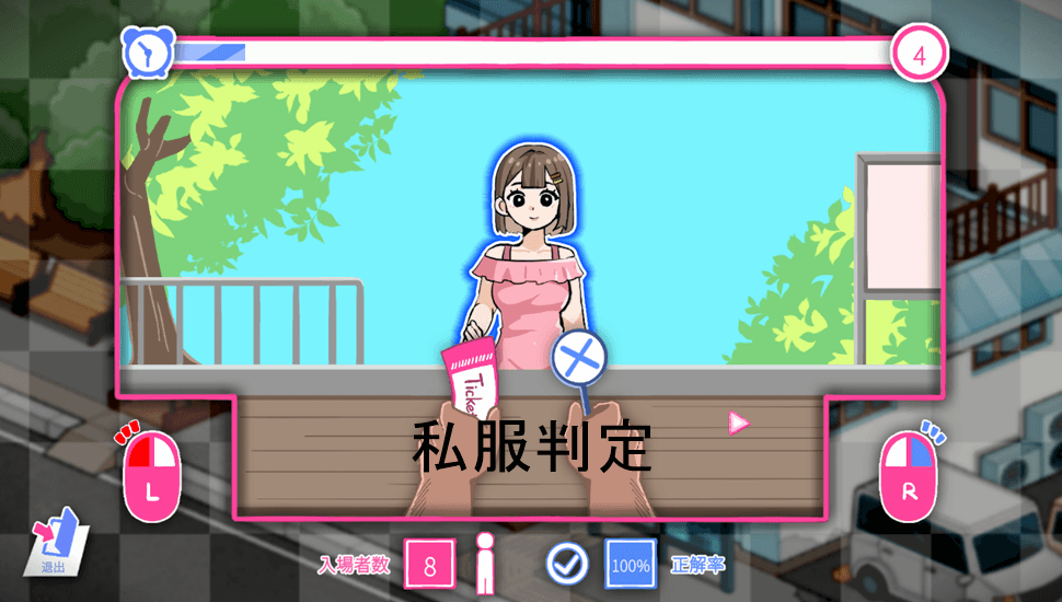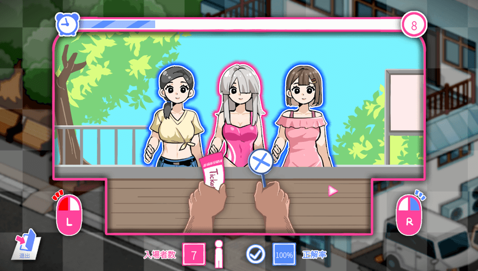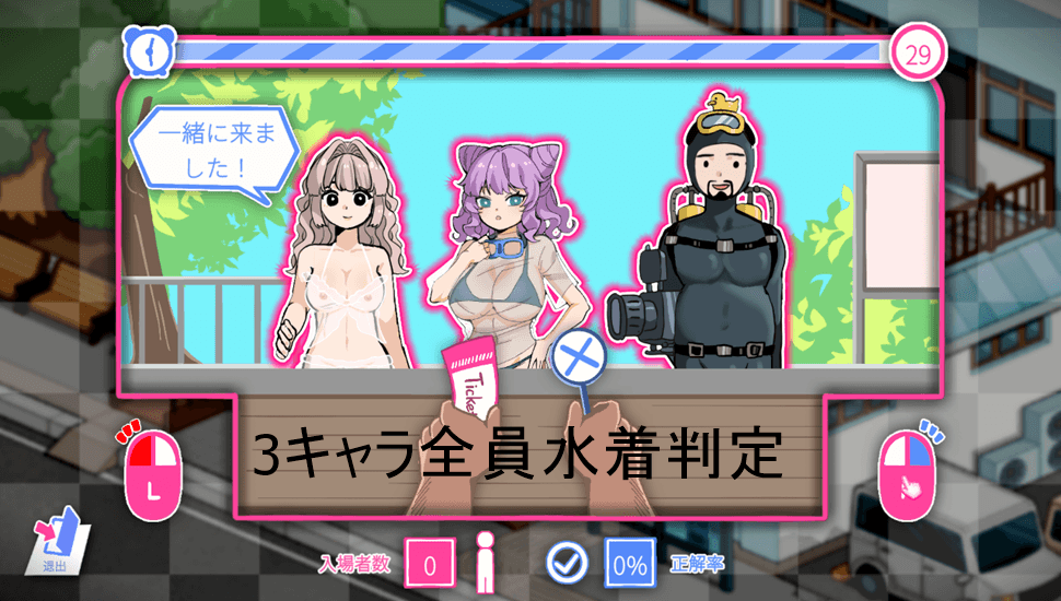 昼には利用客が訪れているので「チケット」コマンドで接客活動を行う事ができます。この接客はミニゲーム形式となっていて、水着の客を通して私服・裸の客を拒否する検問のようなゲームシステムとなっています。ミス無く上手く進める事で接客終了後に多くの報酬を獲得できます。