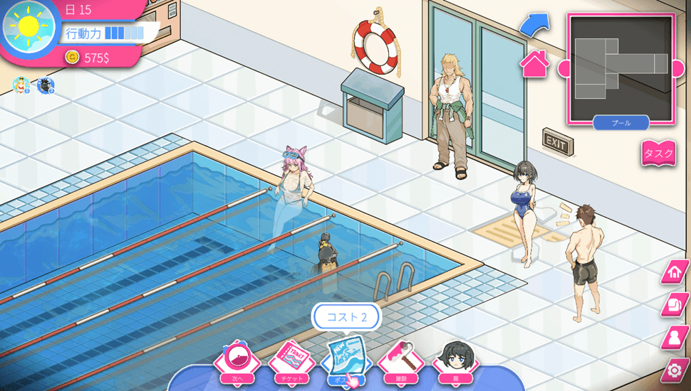 ゲームの目的の1つはオーナーをしているプールを適切に経営して人気施設へと発展させる事です。1日が始まるとまずその日にプールで開催するイベントを3つの中から選択する事になり、選んだイベントによって数日間プールの人気や収入が増加する恩恵を受ける事ができます。